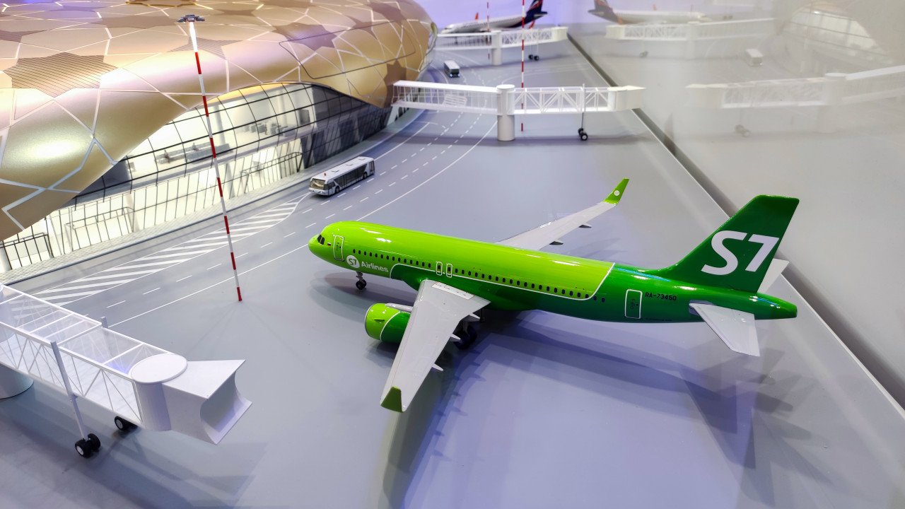 Экран с аэрофотосъёмкой медицинского комплекса на стенде выставки