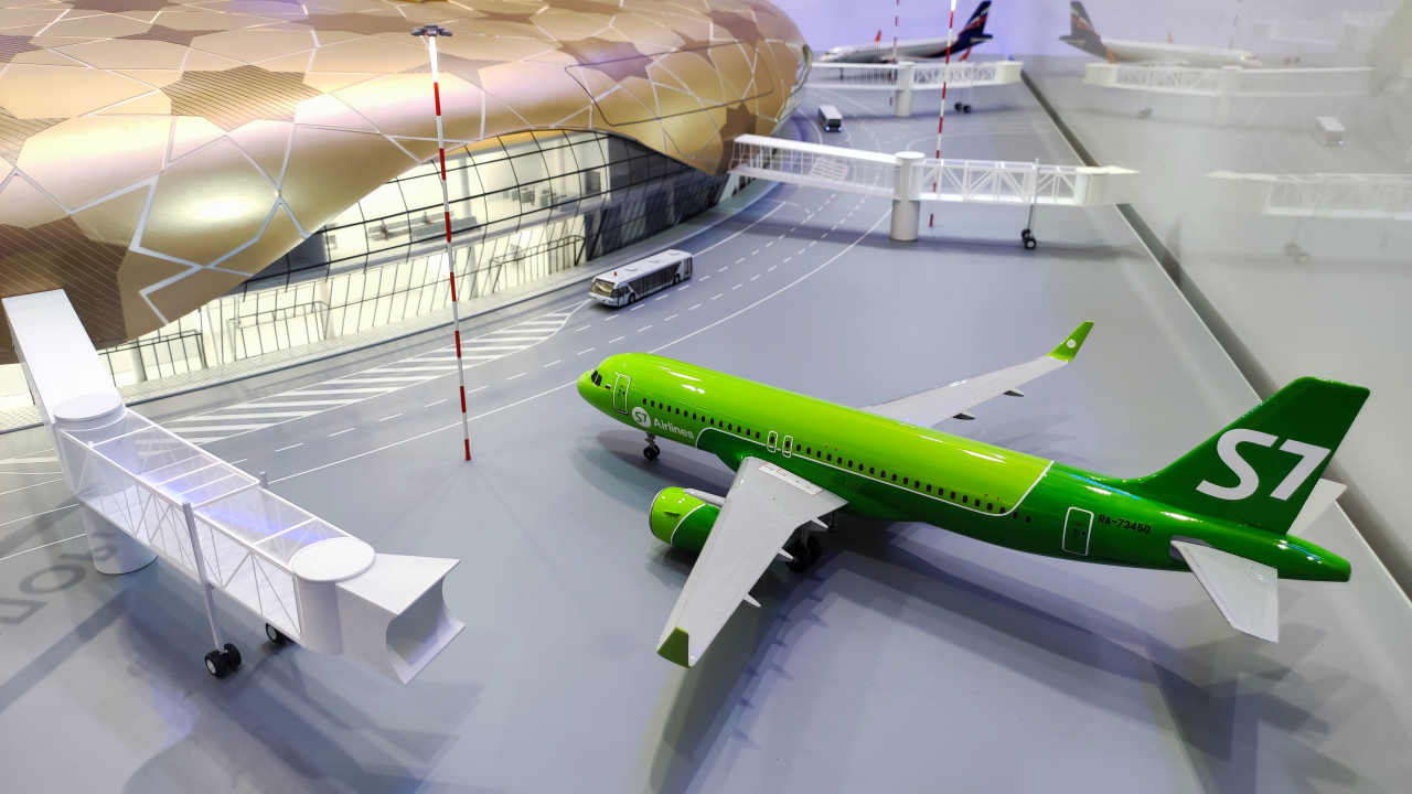 Макет самолёта S7 Airlines на демонстрационной площадке внутри павильона ВДНХ