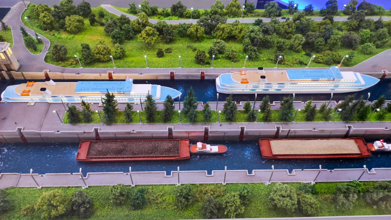 Здания и прогулочные зоны макета «Атомграда» у водной линии в павильоне «АТОМ»