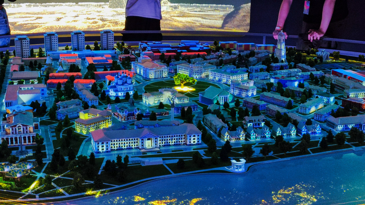 Макет жилого квартала с высотными домами и спортивными площадками