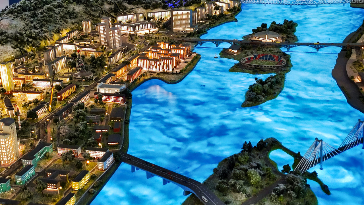 Макет дворовой территории с жилыми домами, парковкой и городскими дорогами