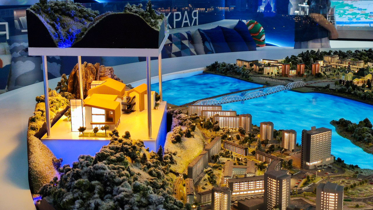 Модель здания «Омск Арены» с припаркованными перед ним автомобилями