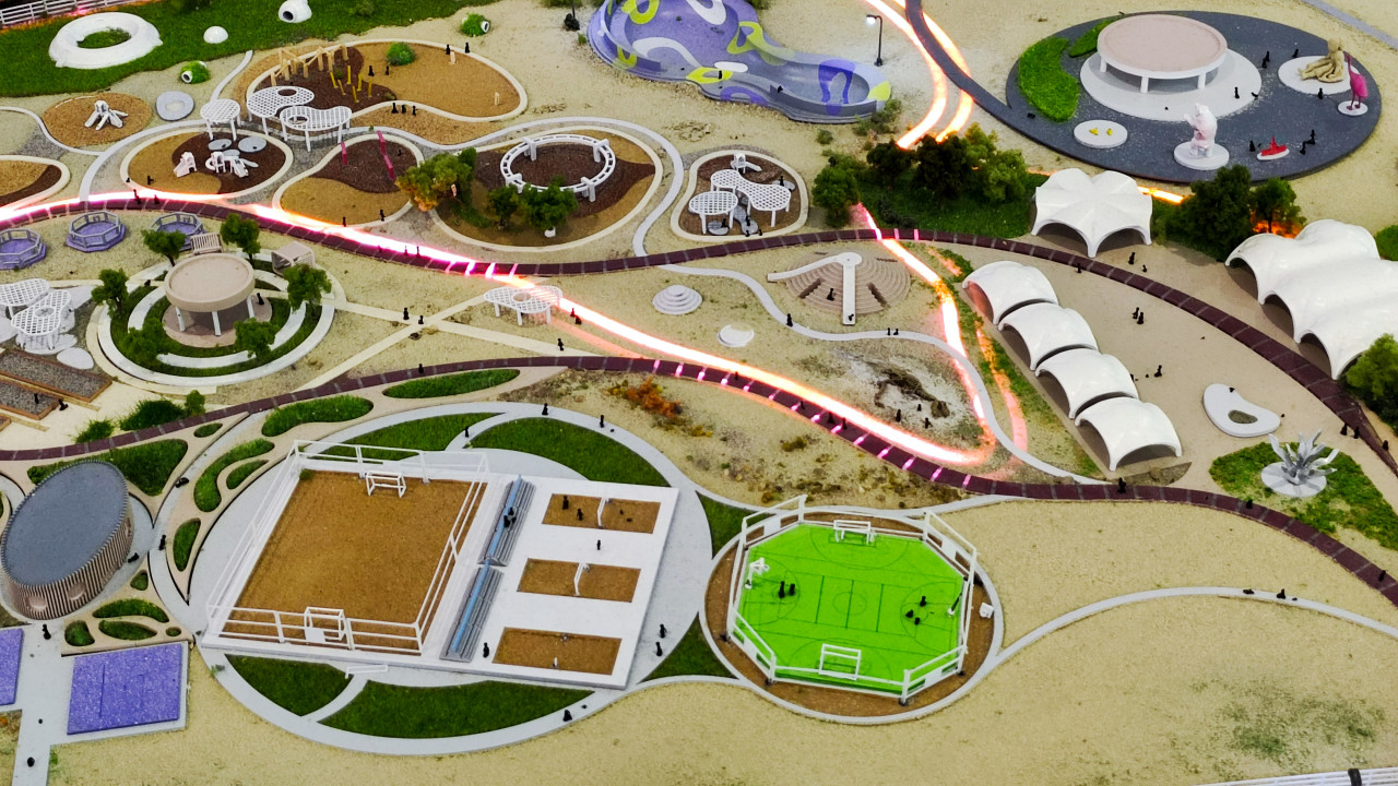 Железнодорожный локомотив и грузовые платформы под портальным краном в макете терминала