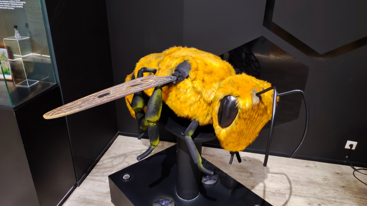 Макет ветрогенератора на фоне мультимедийного экрана на выставке в павильоне №75 ВДНХ