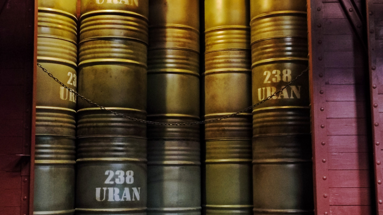 Металлические бочки «238 URAN» и ящики возле рампы музейной инсталляции