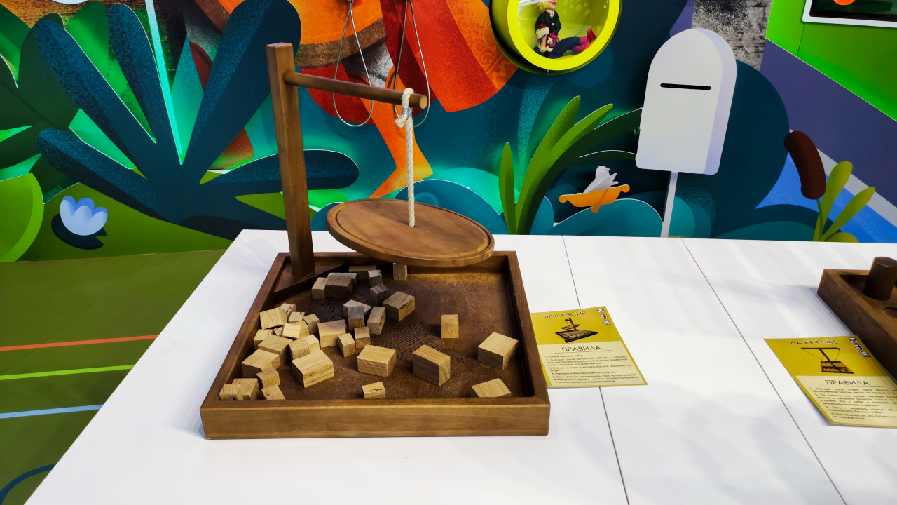 Экспозиционный макет крана перед медиаэкраном в павильоне «Поволжье»