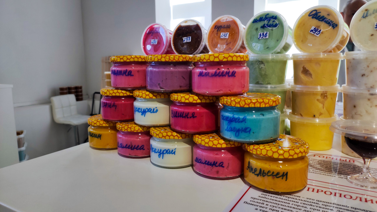 мед пчеловодство продукты пчеловодства натуральный продукт еда продукты питания ассортимент меда выставка ярмарка торговая экспозиция витрина сельское хозяйствоПохожие фотографии