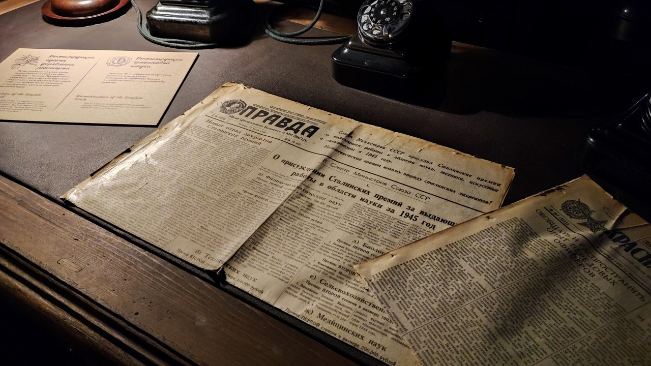 Рулоны бумаги, карандаши и чертёжный угольник у стенда с техническими схемами
