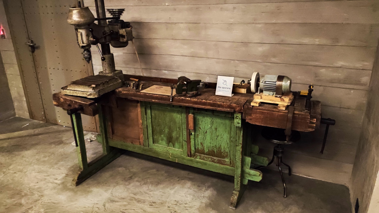 Настольная лампа и рулоны бумаги на инженерном столе в павильоне «Атом»