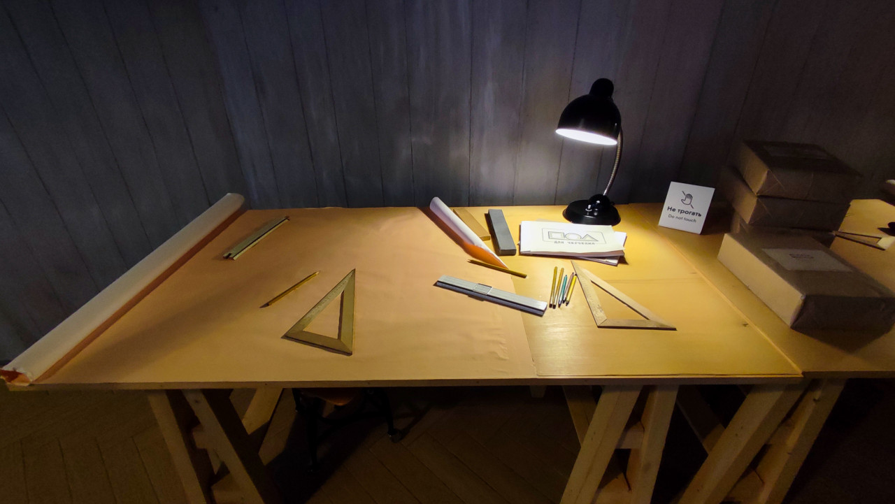 Пакет чертёжной бумаги на инженерном столе экспозиции павильона «Атом»