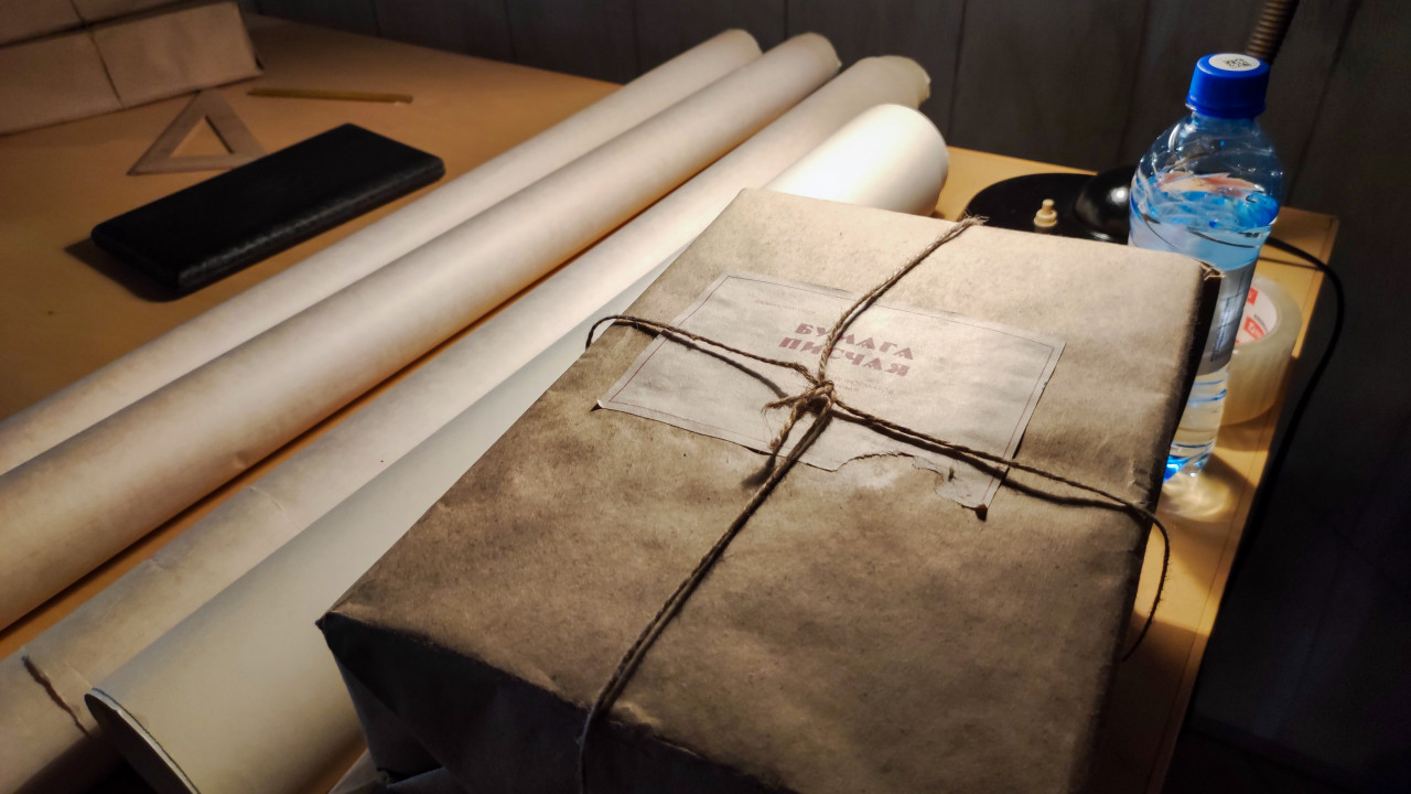 Рабочий стол с ретро-предметами в интерьере зоны «Прошлое» выставки «Умные финансы»