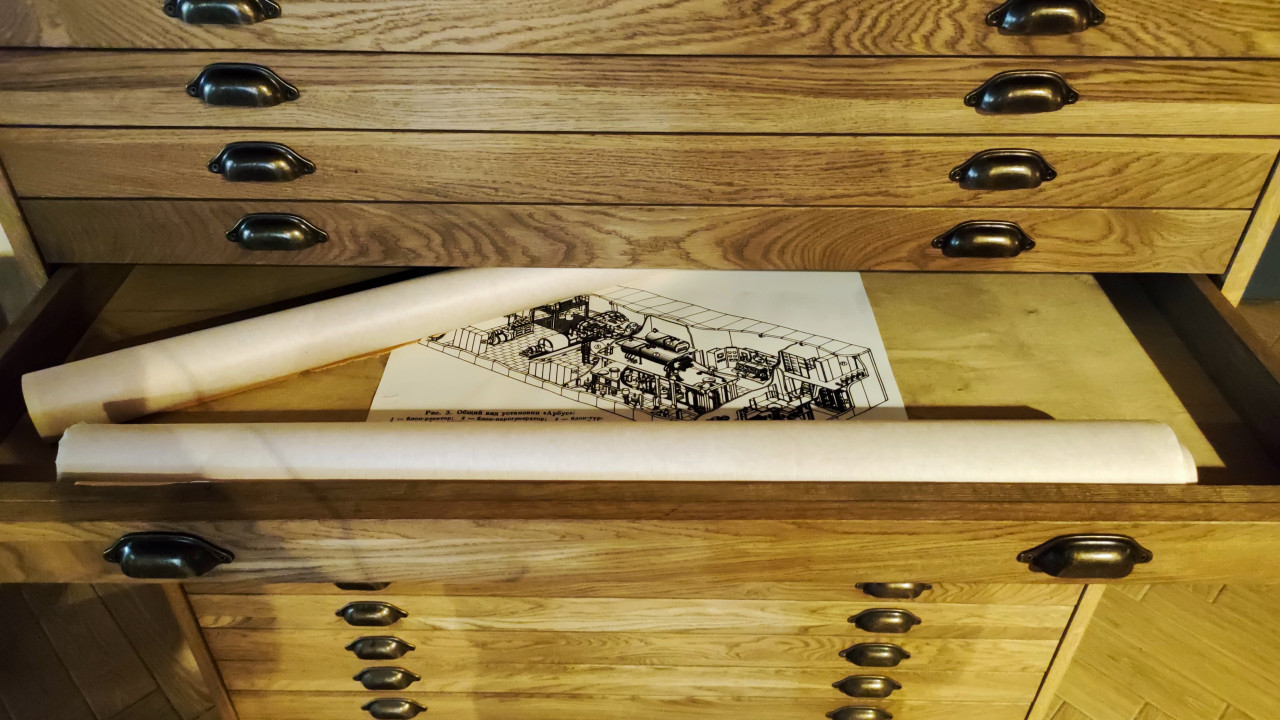 Газеты и ретротелефоны на рабочем столе диспетчерской зоны павильона «АТОМ»