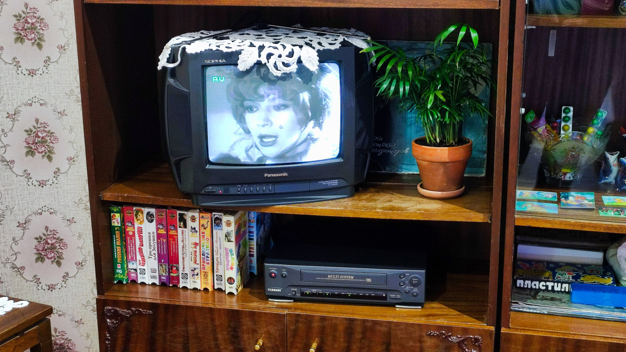 Телевизор «Рекорд» на кружевном столе в музейной экспозиции