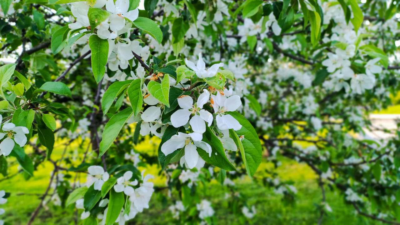 природа растения цветы зелёные насаждения яблоня цветение белые цветы весна зелёные листья ветви макросъёмка парк сезонность лепестки флора ботаника садовые растения солнечный свет зелёная зона естественная среда экология декоративные деревья городская природа свежесть крупный план натуральность гармонияПохожие фотографии