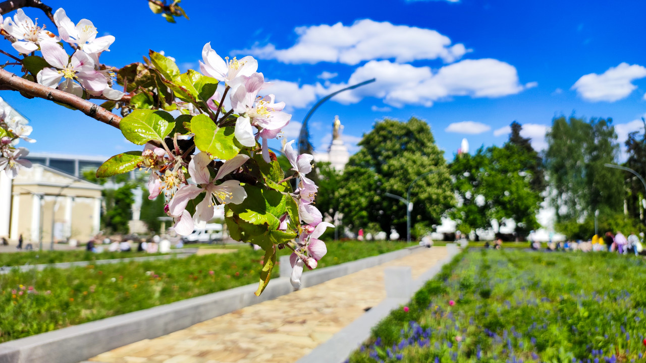 Цветущая яблоня у прогулочной дорожки ВДНХ