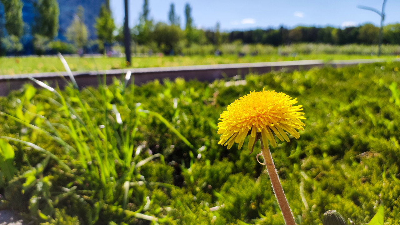 Грунтовая дорога и поле с цветущими одуванчиками