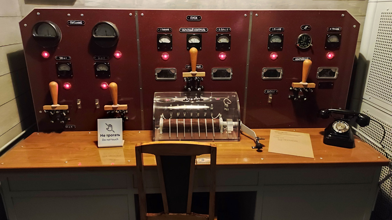 Ряды сигнальных кнопок и индикаторов судовой панели в экспозиции