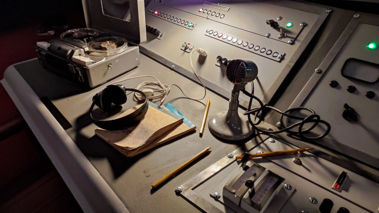Архивные видеокадры на мониторах и ретропульты павильона «АТОМ»