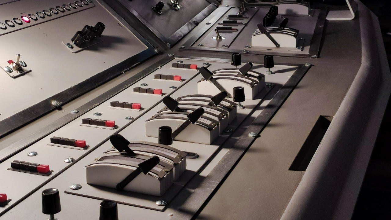 Стена мониторов и ретропульты в экспозиции павильона «АТОМ»