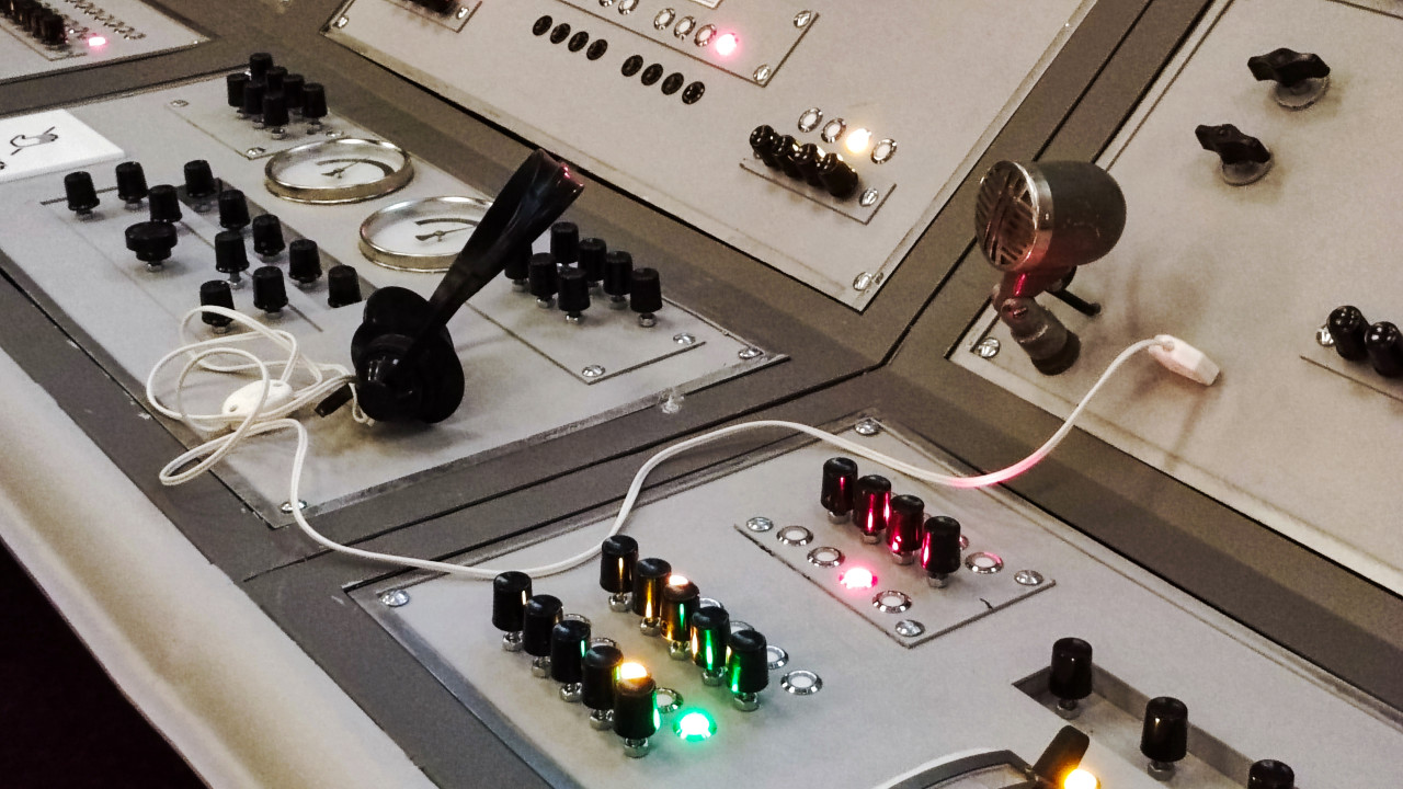 Микрофон и элементы управления на ретропульте павильона «АТОМ»