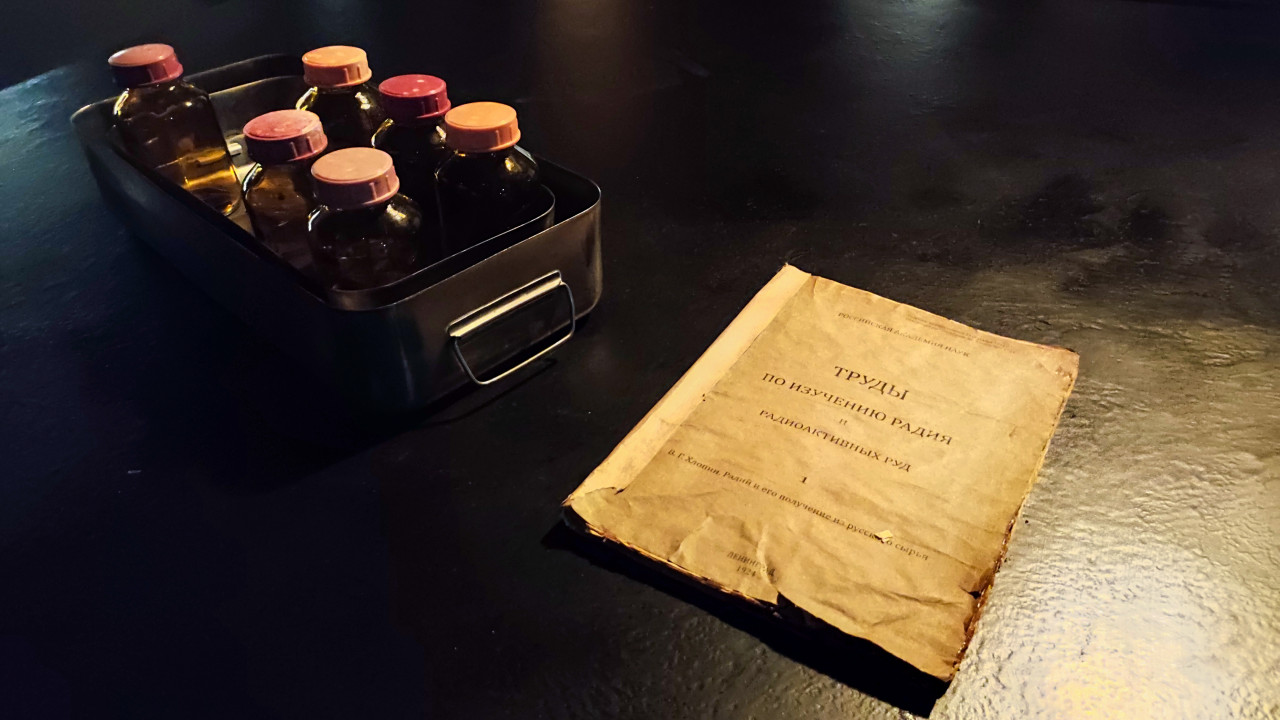 Колбы и химические растворы на газетах середины XX века в экспозиции павильона «АТОМ»