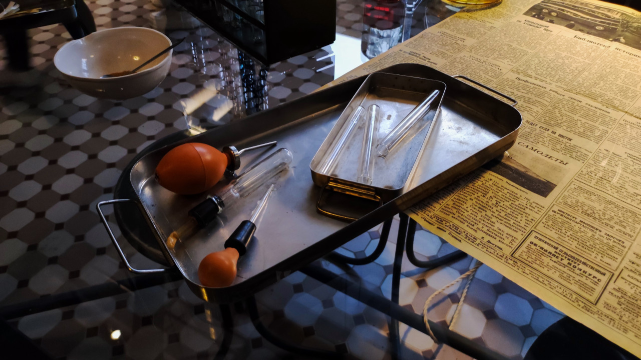 Деревянный штатив с пробирками и стеклянные ёмкости в зоне «Атомариум»
