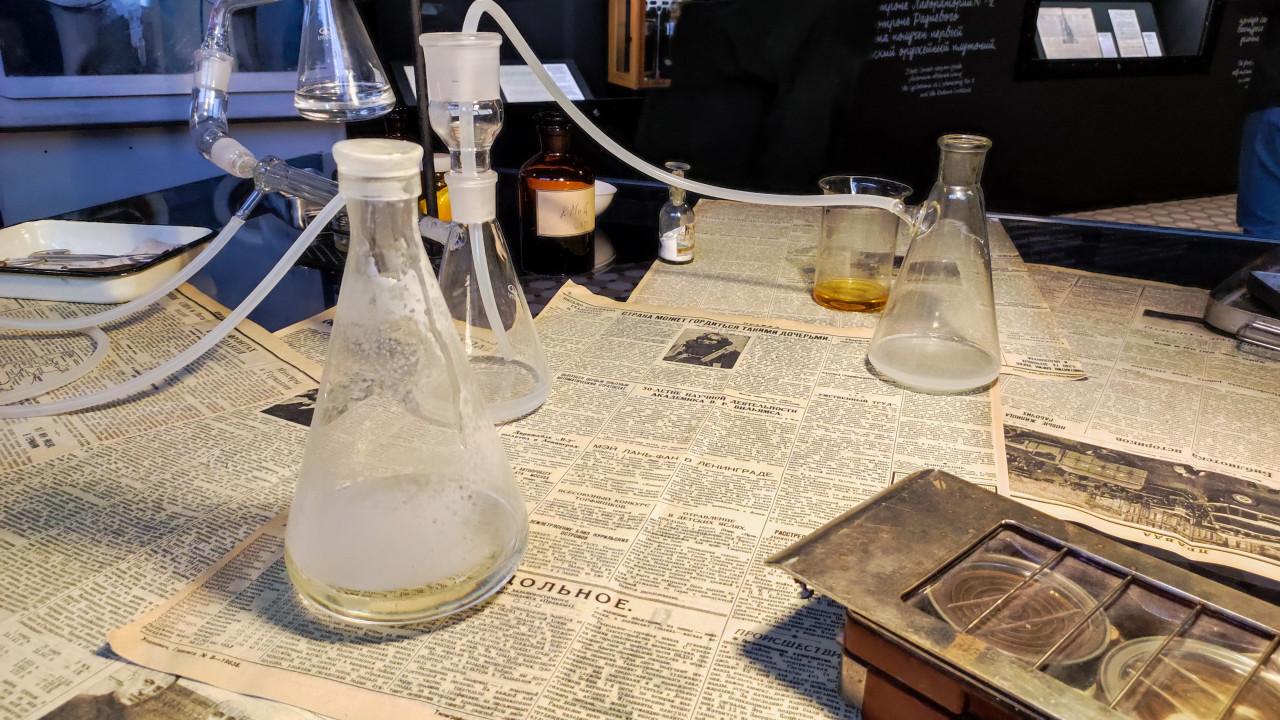 Лабораторный стол с колбами и оборудованием в экспозиции «Атомариума»