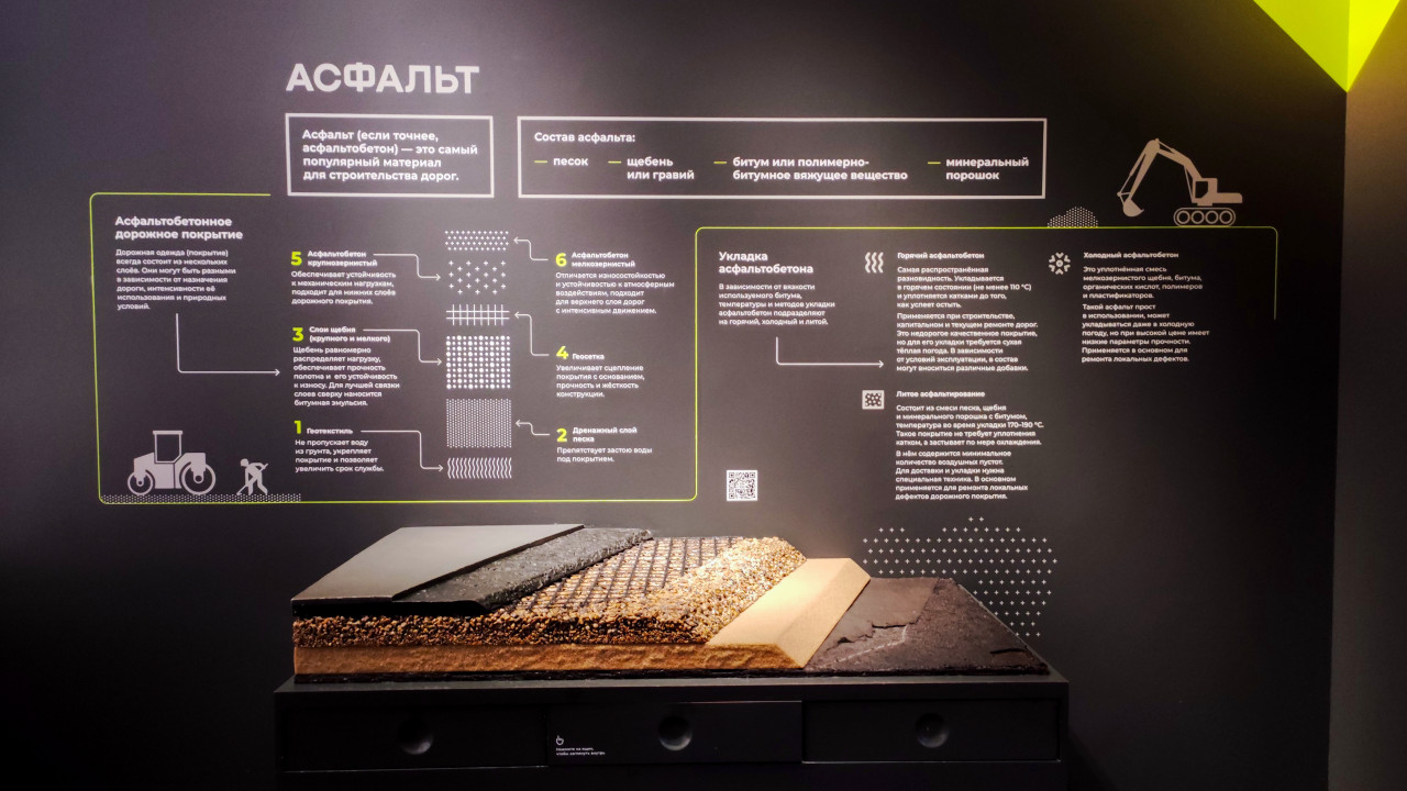 дорожное строительство дорожное покрытие конструкция дороги слои дорожной одежды разрез покрытия городская инфраструктура благоустройство инженерные решения строительные технологии асфальтобетон щебёночное основание демонстрационный макет музейная экспозиция вднх павильон 5Похожие фотографии