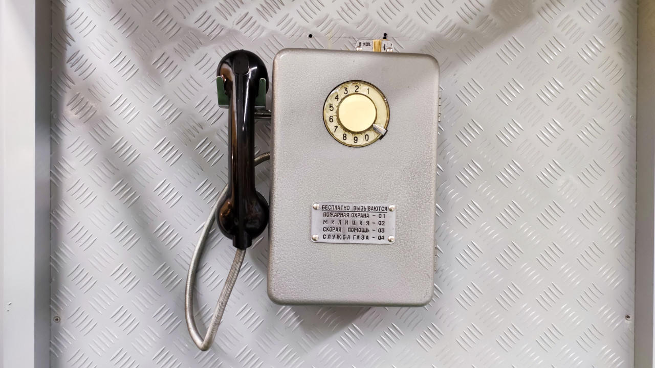 Старый дисковый телефон с надписью Таймыр на кирпичной стене