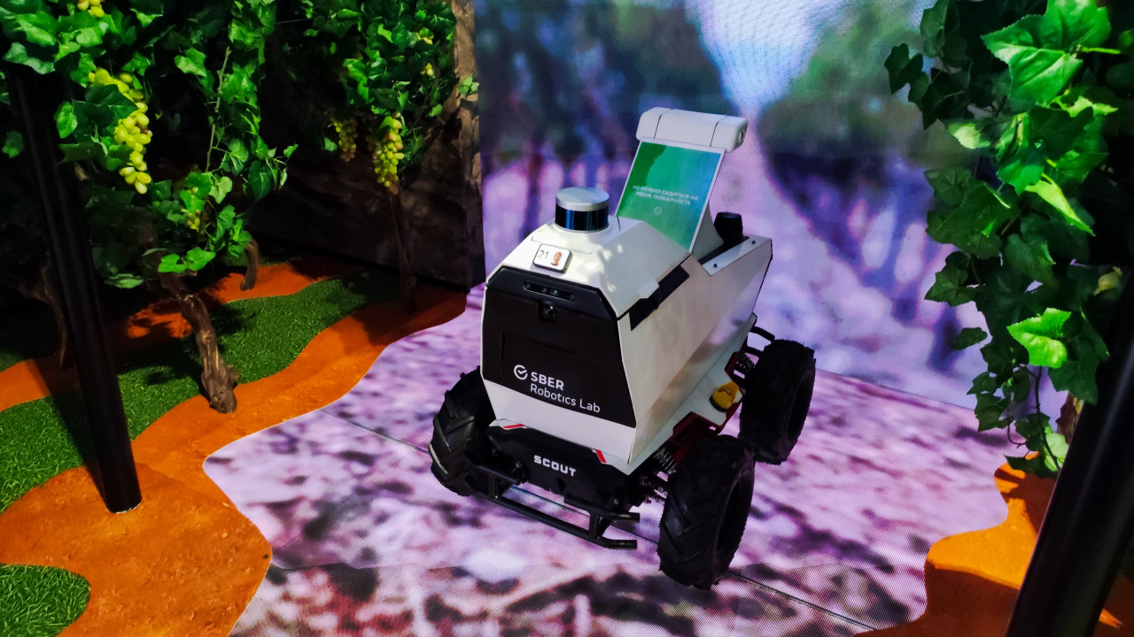 Гуманоидный робот на стенде с цифровыми панелями на выставке «Россия»