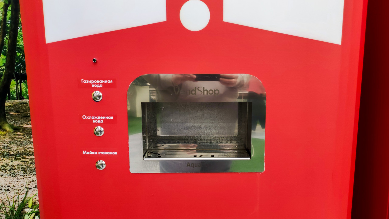 Автоматы газированной воды в декоративной зоне с растениями и жёлтой стеной
