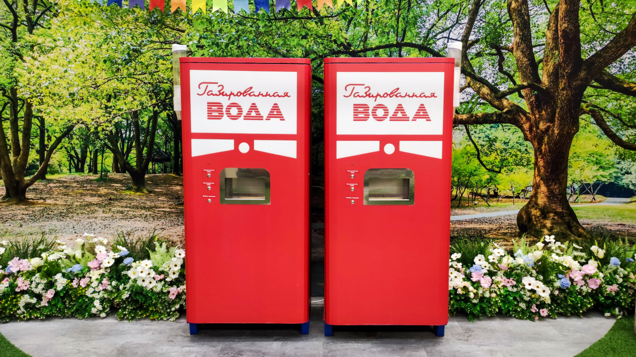 Пара автоматов газированной воды на фоне лесопарковой стилизации