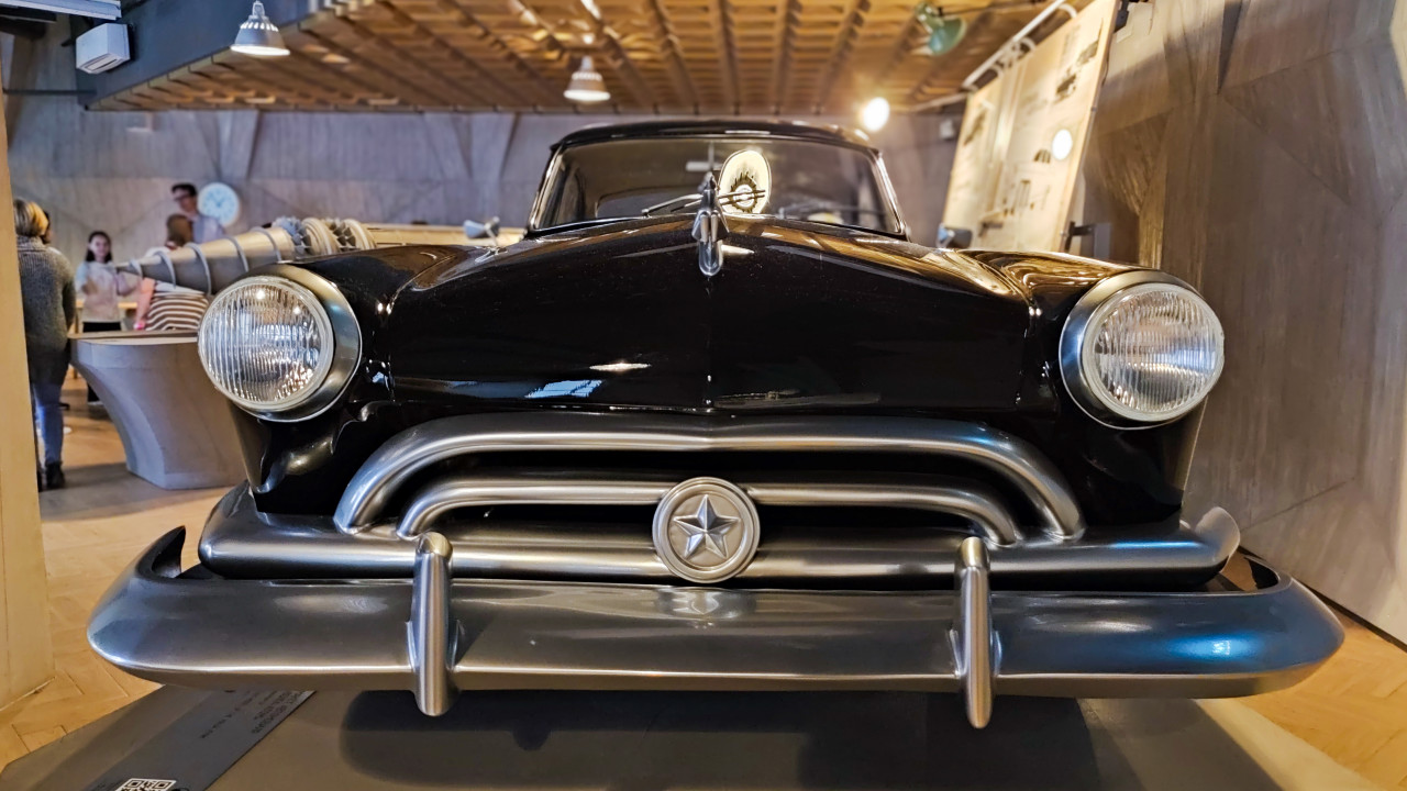 Боковой вид автомобиля с граффити в музейной экспозиции