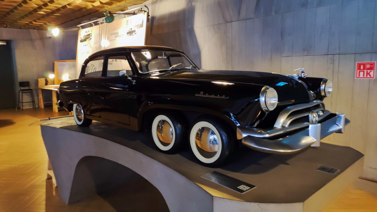 Задний ракурс ГАЗ-21 «Волга» бордового цвета в музее