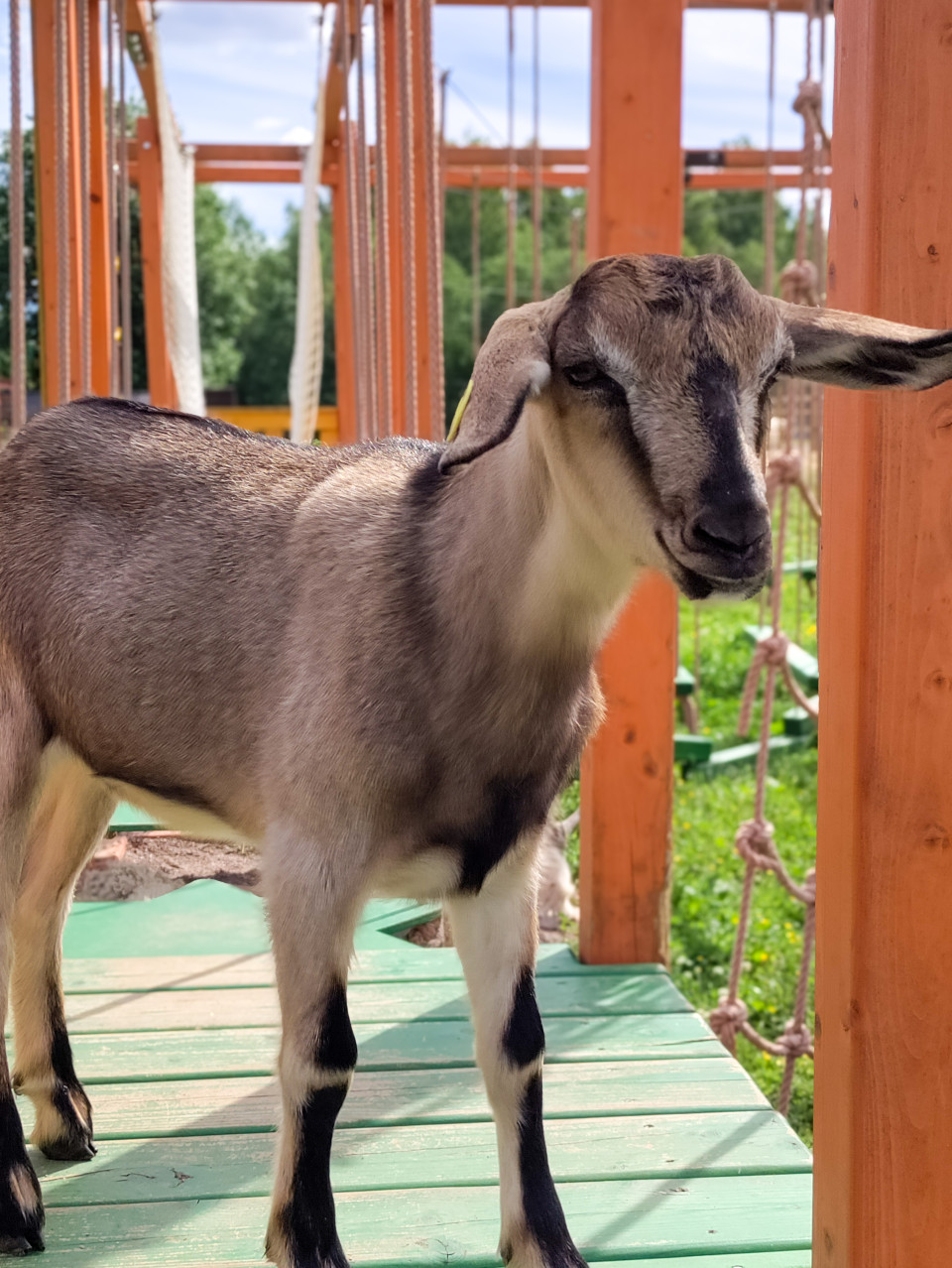 животные домашние животные ферма сельское хозяйство контактный зоопарк фермерский туризм коза козлёнок пастбище загон деревянный забор сено трава лето природа дневной свет молодое животное парнокопытные копытные шерсть длинные уши морда животного портрет животного ушная бирка мини ферма содержание животных прогулка деревянная конструкция детская площадка верёвочные канаты канатный маршрут зелёный настил оранжевые опоры сельский туризмПохожие фотографии