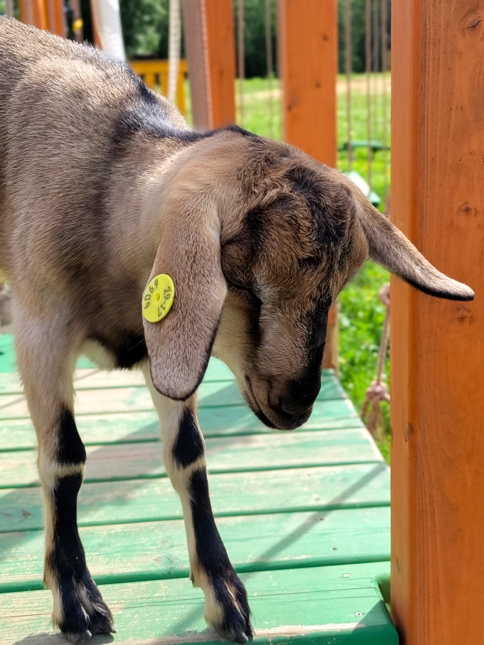На фото молодая коза стоит на зелёной платформе и опускает голову, будто изучает поверхность настила. Слева чётко видна жёлтая ушная бирка с номером, длинные уши и тёмная маска на морде; рядом проходит оранжевая стойка и верёвочный элемент с узлами. На заднем плане просматриваются трава и другие части площадки, съёмка выполнена днём при ярком солнце. Кадр подходит для материалов о маркировке сельхозживотных, работе мини-ферм, контактных зоопарках и обучающих публикаций о животноводстве.