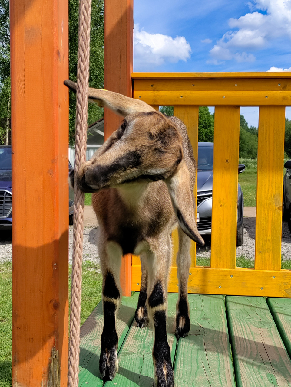 животные домашние животные ферма сельское хозяйство контактный зоопарк фермерский туризм коза козлёнок пастбище загон деревянный забор сено трава лето сельская местность природа солнечный день небо облака молодое животное парнокопытные копытные длинные уши ушная бирка мини ферма прогулка площадка деревянная конструкция детская площадка зелёный настил жёлтые перила оранжевые опоры канат верёвка автомобили на фонеПохожие фотографии