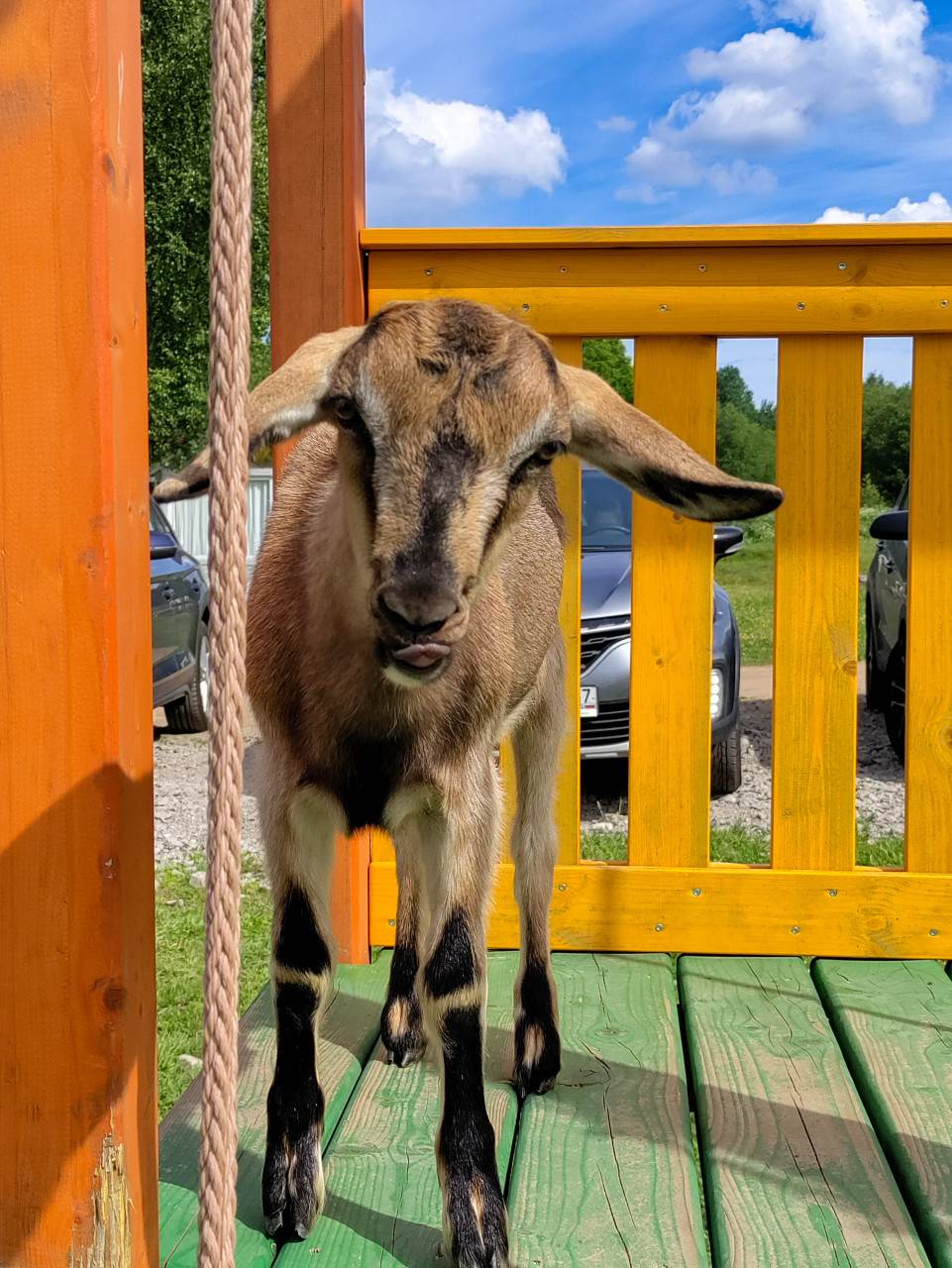 животные домашние животные ферма сельское хозяйство контактный зоопарк фермерский туризм коза козлёнок пастбище загон деревянный забор сено трава лето сельский отдых природа дневной свет небо облака молодая коза парнокопытные копытные длинные уши ушная бирка портрет животного мини ферма деревянная площадка детская площадка зелёный настил жёлтые перила оранжевые опоры канат верёвка автомобили на фонеПохожие фотографии