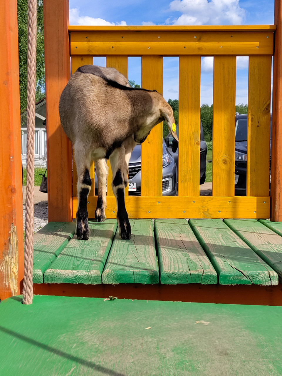 Молодая коза стоит на зелёном настиле, повернувшись спиной к камере и глядя через жёлтые перила в сторону двора. Хорошо читаются контуры спины и ног, на ухе заметна бирка; слева проходит верёвочный элемент у оранжевой стойки. Через ограждение видны припаркованные автомобили и зелёная территория, освещение солнечное, небо голубое с облаками. Фото подходит для иллюстраций о фермерских животных, сельском туризме, контактных зоопарках и прогулках на свежем воздухе.