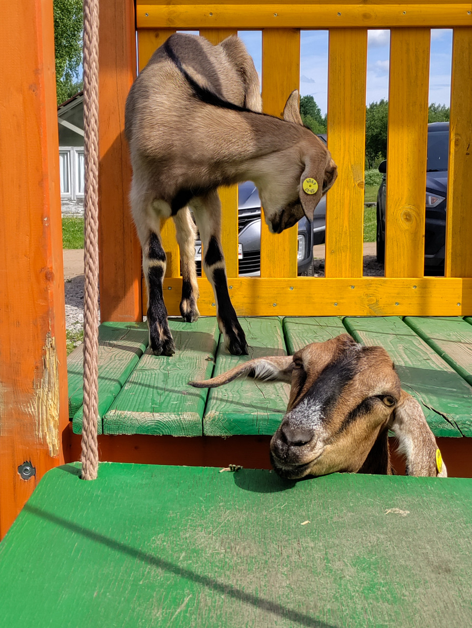 На деревянной конструкции одна молодая коза стоит на верхней зелёной платформе возле жёлтых перил и оранжевой стойки, а в нижней части кадра из-за края настила выглядывает голова другой козы. Между уровнями проходит свисающий канат, видны стыки досок и тени от конструкции; через ограждение просматриваются автомобили и двор. Съёмка выполнена в солнечный день при голубом небе с облаками. Фото подходит для иллюстраций о контактных зоопарках, семейных фермах, содержании коз и сюжетов про взаимодействие животных.