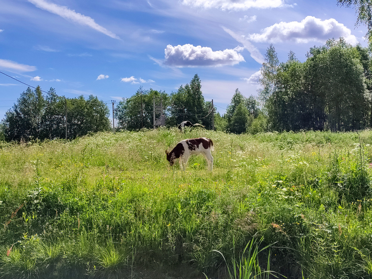 природа сельское хозяйство животноводство крупный рогатый скот корова телёнок пастбище луг высокая трава лето сельская местность деревня выпас кормление разнотравье полевые растения деревенская местность фермерство стадо лесной край деревья голубое небо облака солнечный свет линия электропередачи провода опоры сельский пейзаж экология природный ландшафтПохожие фотографии