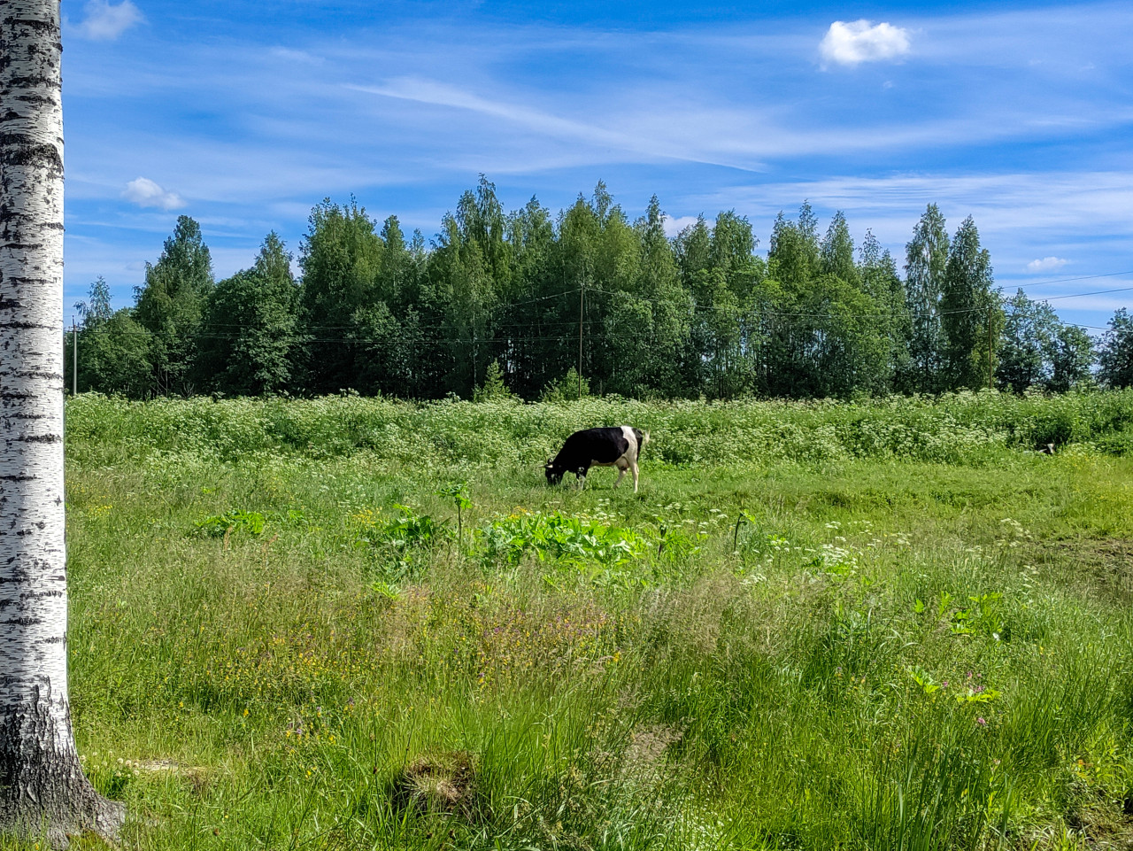 На снимке черно-белая корова пасется на травянистом лугу, опустив голову к земле. Слева в кадре крупно виден ствол березы, на заднем плане тянется полоса деревьев и густые заросли, над ними высокое голубое небо с тонкими облаками. В траве заметны участки луговых растений и разная высота покрова; через поле проходят провода, что указывает на сельскую инфраструктуру. Освещение дневное, летнее, с четкими тенями в траве. Фото можно использовать в материалах о животноводстве, пастбищах, сельском ландшафте и сезонной природе.