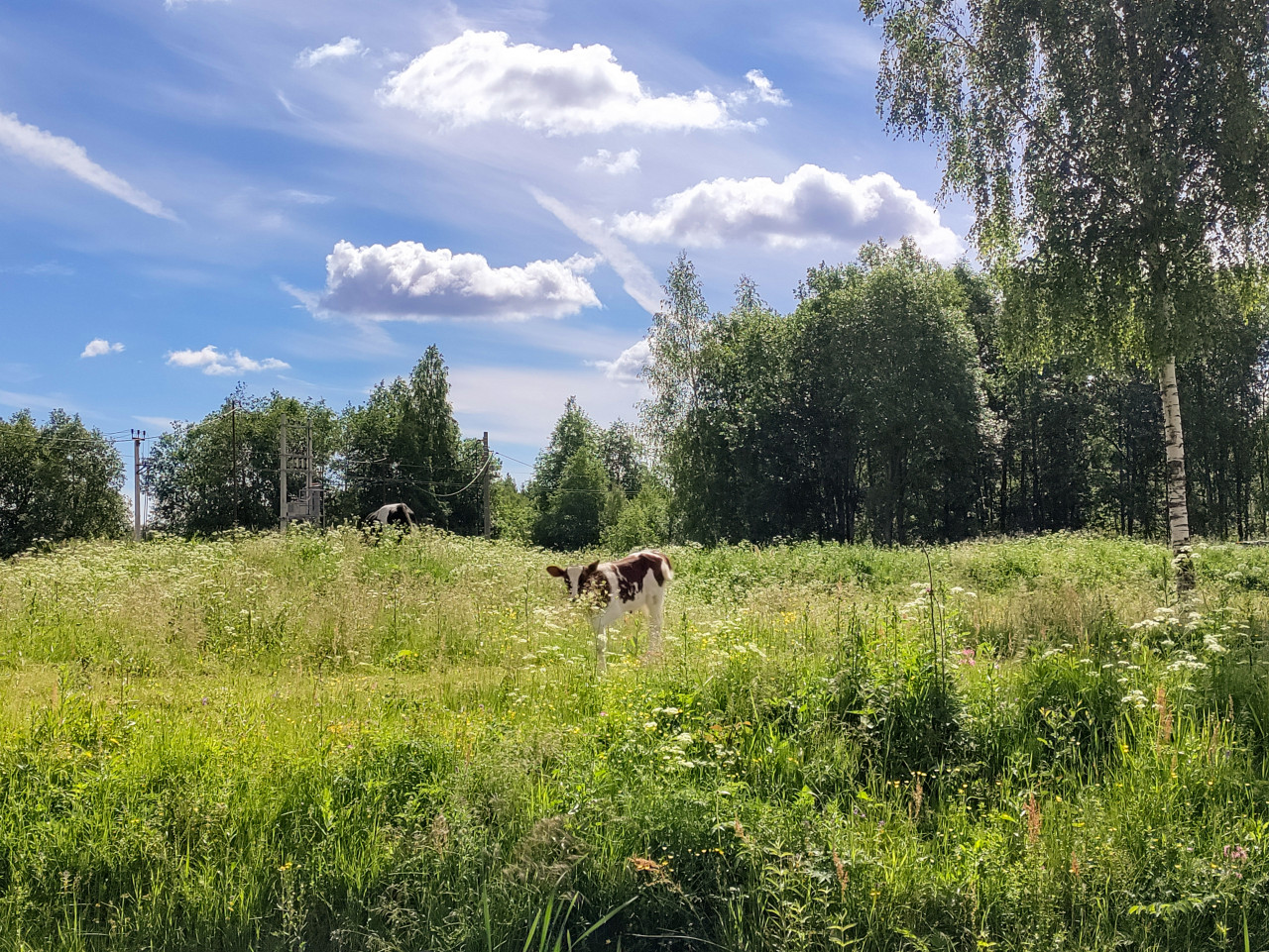 Летний сельский пейзаж: на переднем плане телёнок с бело-коричневой мастью стоит в высокой траве и полевых растениях, на заднем плане видна взрослая корова у кромки деревьев. Слева проходят опоры и провода линии электропередачи, вдалеке заметны элементы электрооборудования. Справа кадр ограничивает берёза и густая зелёная посадка, над лугом голубое небо с кучевыми облаками и тонкими следами облачности. Фото подходит для тем животноводства, сельского хозяйства, пастбищ, экологии и иллюстраций про деревенскую местность.