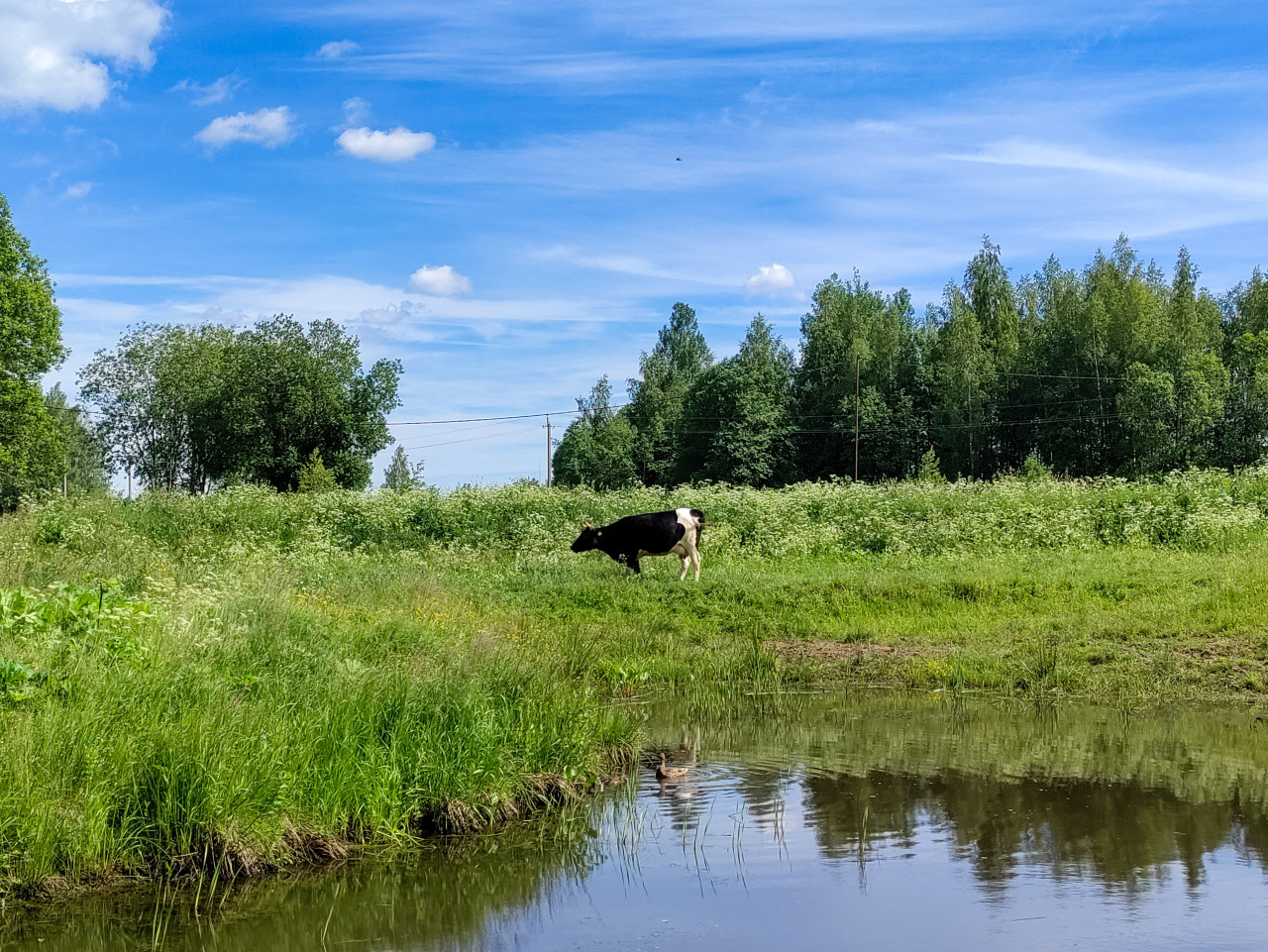 Летний сельский пейзаж: на переднем плане спокойная вода небольшого пруда или заводи с отражением облаков и линии деревьев; у кромки берега растут камыши и высокая трава. На противоположном берегу на зелёном лугу пасётся чёрно-белая корова, голова опущена к траве. В воде заметна водоплавающая птица, от неё расходятся круги по поверхности. На заднем плане — кусты, лесная опушка и провода линии электропередач. Использование: материалы о сельском хозяйстве, природе, пастбищах, экотуризме и деревенских ландшафтах.