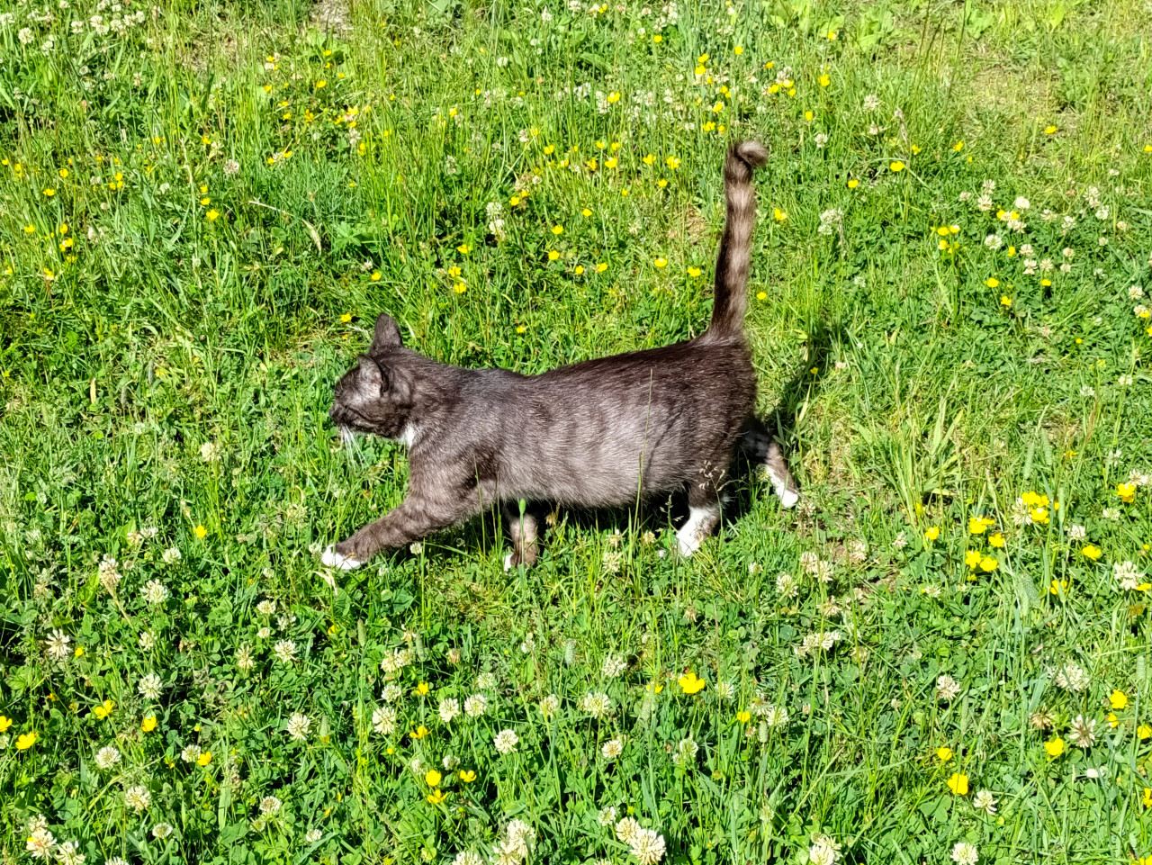 животные кошка домашняя кошка питомец прогулка лето природа луг трава полевые цветы клевер солнечный день поведение животных зеленый фон шерсть усы хвост профиль движение сельская местность белые соцветия желтые цветы газон естественная среда без людей дневной свет летняя растительностьПохожие фотографии