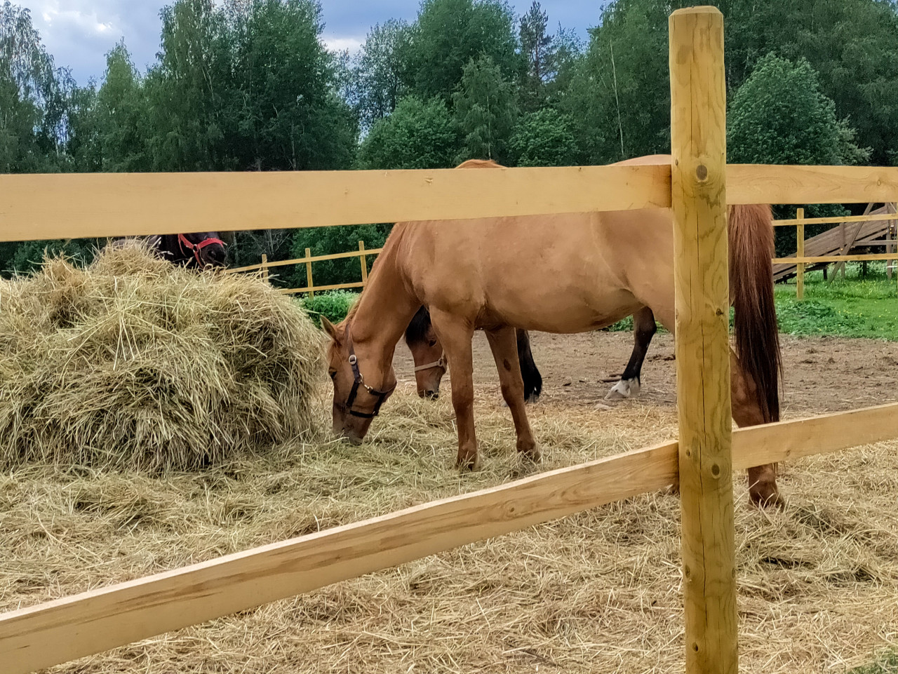 На фотографии запечатлён конный загон на открытом воздухе. На переднем плане проходит деревянный забор из досок с вертикальной стойкой, за ним лежит большой стог сена и рассыпана солома. Рыжевато-бурая лошадь в недоуздке опустила голову и ест корм; позади частично видна тёмная лошадь, вокруг заметны участки зелёной травы и следы вытаптывания. Грунт утрамбован, ограждение продолжается вдоль площадки, на фоне стоят деревья и лесная полоса под облачным небом. Фото можно использовать для публикаций о коневодстве, кормлении и содержании лошадей, а также для рекламы конных клубов.
