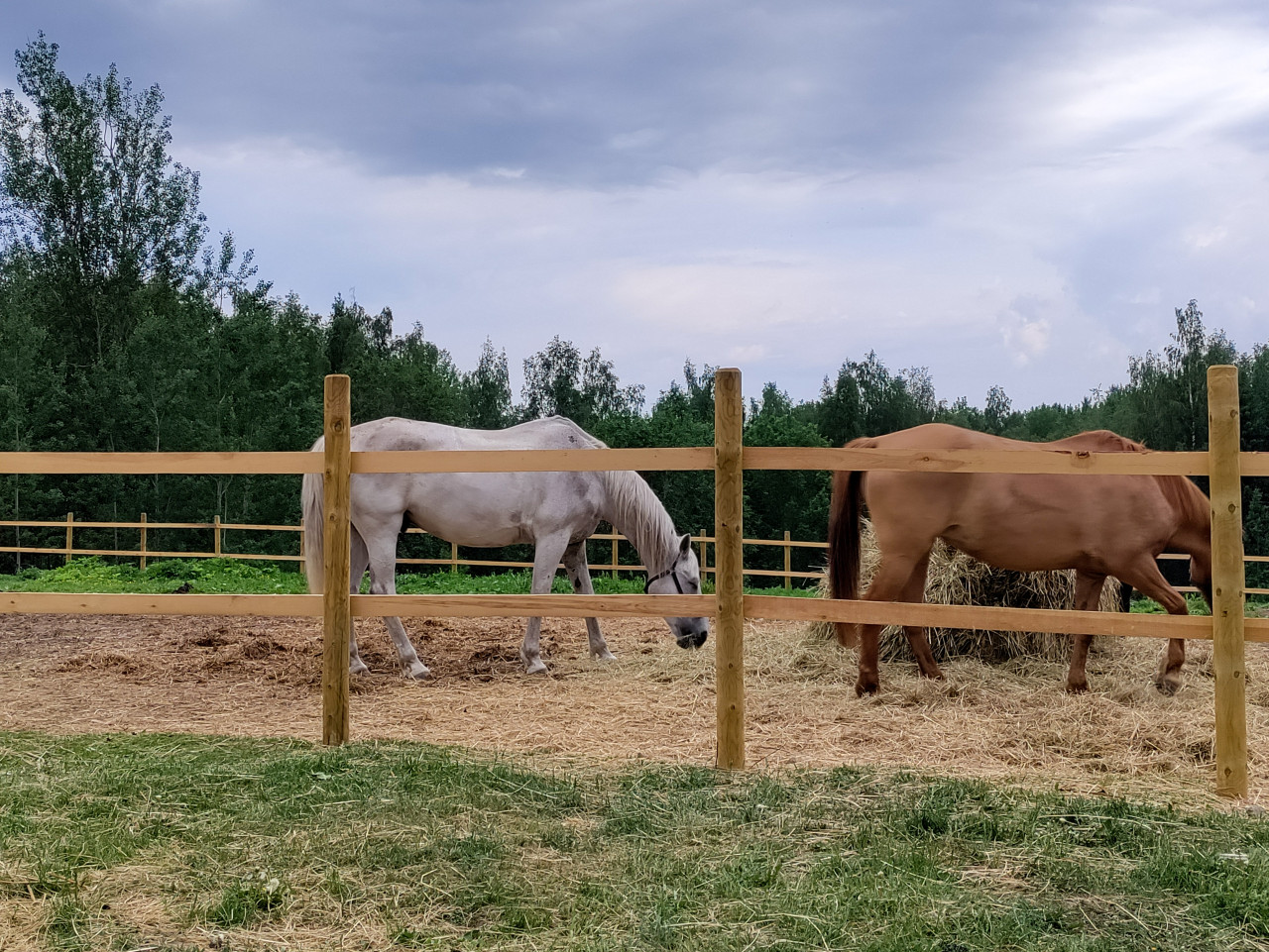 Снимок сделан у ограждения конного загона: деревянные стойки и рейки занимают передний план. За забором видны две лошади, светлая и рыжая, которые опустили головы к рассыпанному корму на подстилке из соломы. На заднем плане заметны дополнительные секции ограждения и линия леса. Небо затянуто облаками, свет рассеянный, без резких теней. Фотография подходит для иллюстраций о кормлении лошадей, условиях содержания в паддоке, работе конных клубов и сельском хозяйстве.