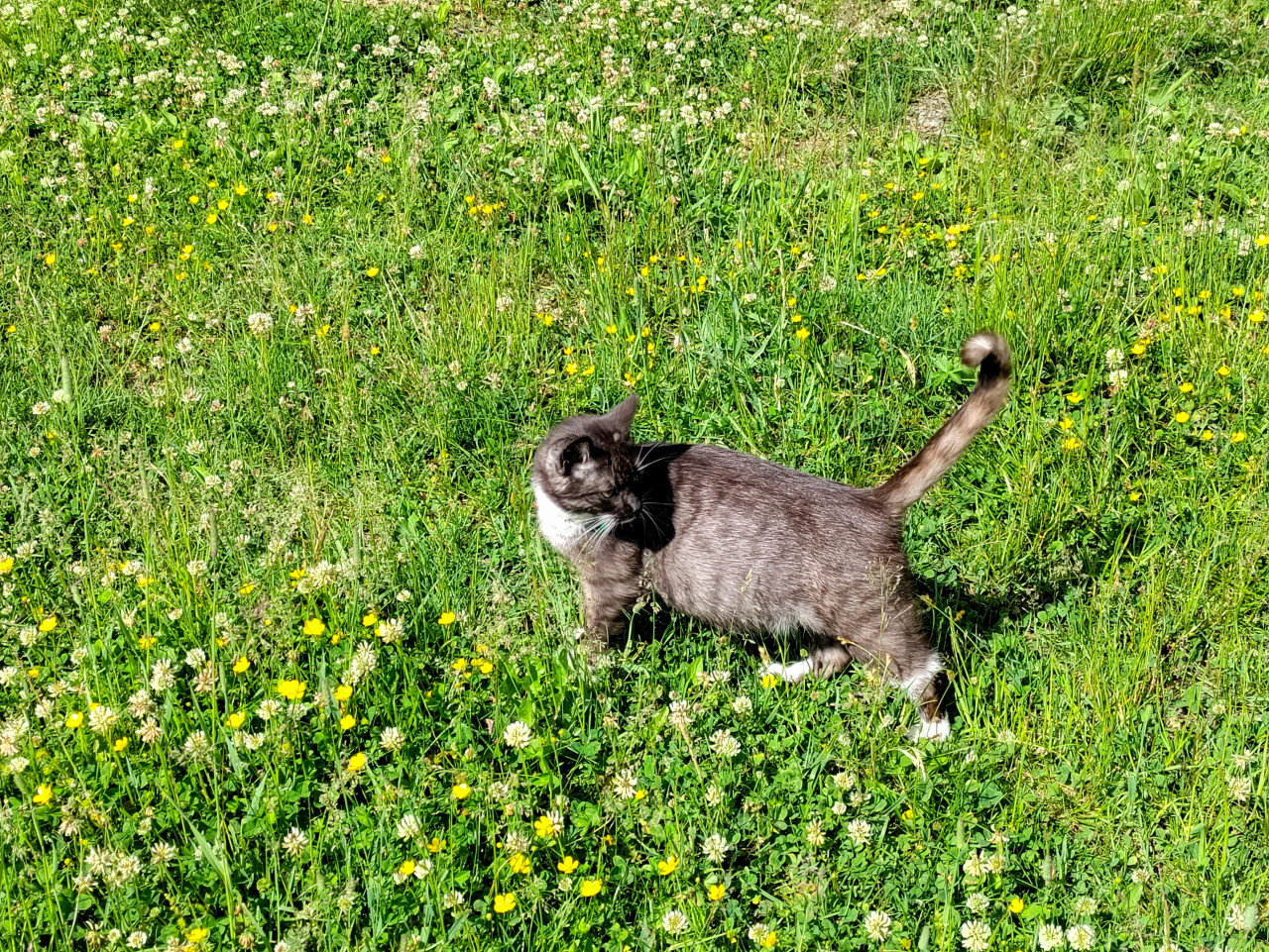 животные кошка домашняя кошка питомец прогулка лето природа луг трава полевые цветы клевер солнечный день поведение животных поведение кошки настороженность оглядывается травяной покров полевые растения белые цветы желтые цветы зеленая трава тень усы шерсть короткошерстная естественный фон без людей сельская местность наблюдение движение животное в траве летняя природаПохожие фотографии