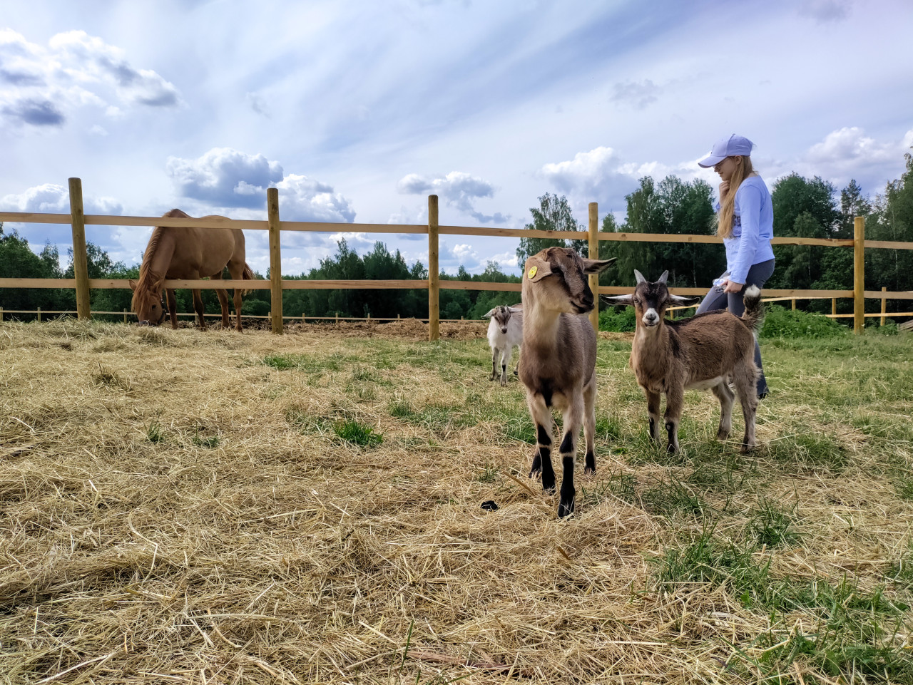На огороженном пастбище две козы стоят на траве и сене у деревянного забора, рядом проходит девушка в бейсболке и повседневной одежде. В глубине кадра заметен белый козленок, а слева за ограждением пасется рыжая лошадь. Окружение сельское: ровные секции забора, вытоптанный участок земли и линия леса на горизонте. Над площадкой высокое облачное небо, что указывает на съемку в теплый сезон и дневное время. Фотография подойдет для тем о фермерском туризме, взаимодействии человека с животными, зоотерапии и семейном отдыхе на ферме.