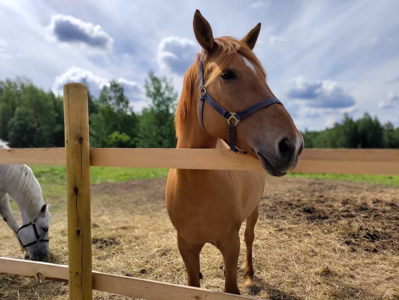 животные лошадь лошади коневодство ферма конюшня конный клуб загон паддок деревянный забор сено кормление уход за животными сельская местность пастбище ограждение портрет животного крупный план морда лошади грива уши недоуздок амуниция рыжая лошадь белая лошадь солома грунт лето дневной свет облака небо лес на фоне сельский туризмПохожие фотографии